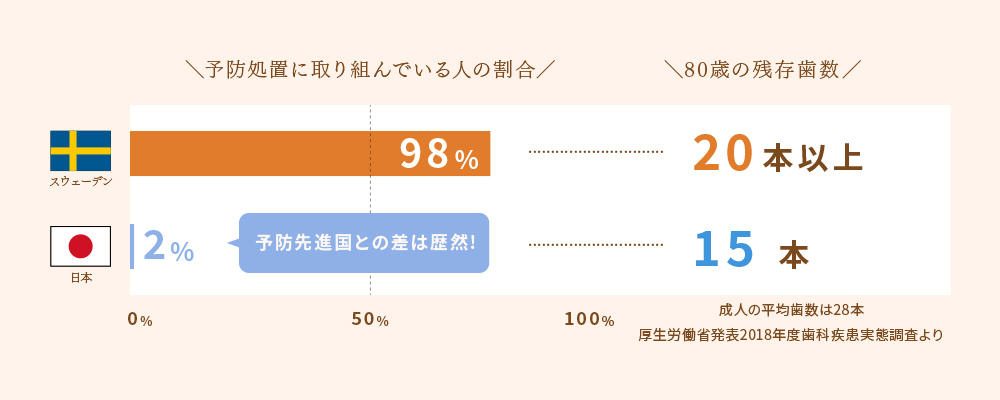 スウェーデンなどの歯科先進国と比べて、日本は歯科疾患に対する予防の意識が低い傾向にあります。歯科先進国では定期健診を受ける人の割合が高く、80歳時の残存歯数も約20本です。対して、日本人は約9本であり明確な差があります。定期的に歯科健診を受けて、健康な口腔内を維持できるようにしましょう。